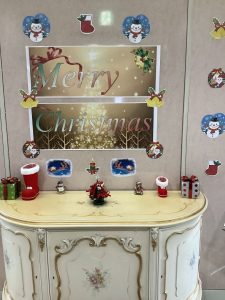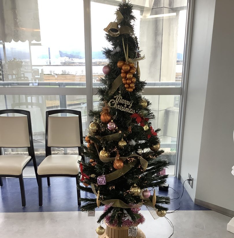 クリスマスの雰囲気を存分に味わっていただくため、会場には大きなクリスマスツリーを設置し、入口も華やかにデコレーションしました!キラキラと輝く装飾に、入居者様も