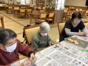 指先を細かく動かしながら、モールを丁寧に曲げたり、小さなビーズを通したりと、一生懸命に手を動かして自分だけのお正月飾りを作り上げられていました。