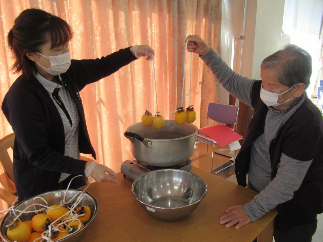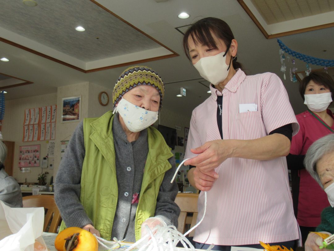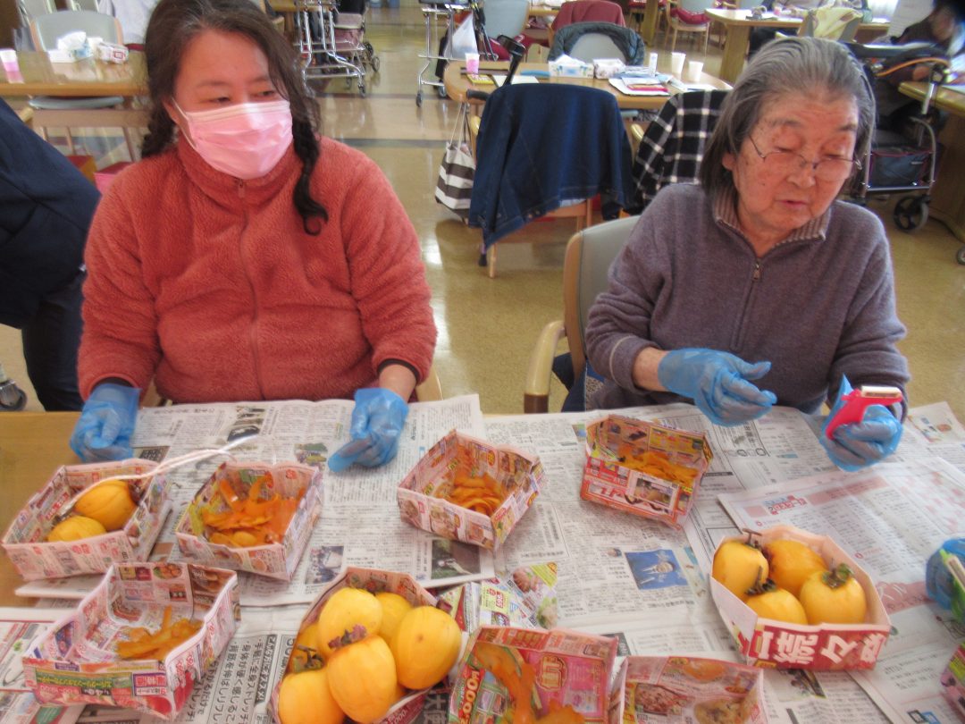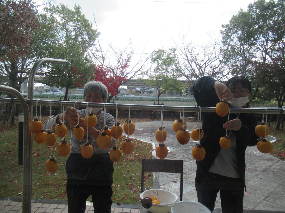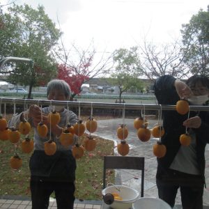 デイセンターザトペックでは、干し柿づくりを行いました。テーブルに並んだ渋柿を見て、「懐かしいね。昔は軒先にずらっと干してなあ。」と、利用者同士の会話も自然と弾みます。皮むきや紐結び、お湯につけたりと職員と一緒に安全に行いました。