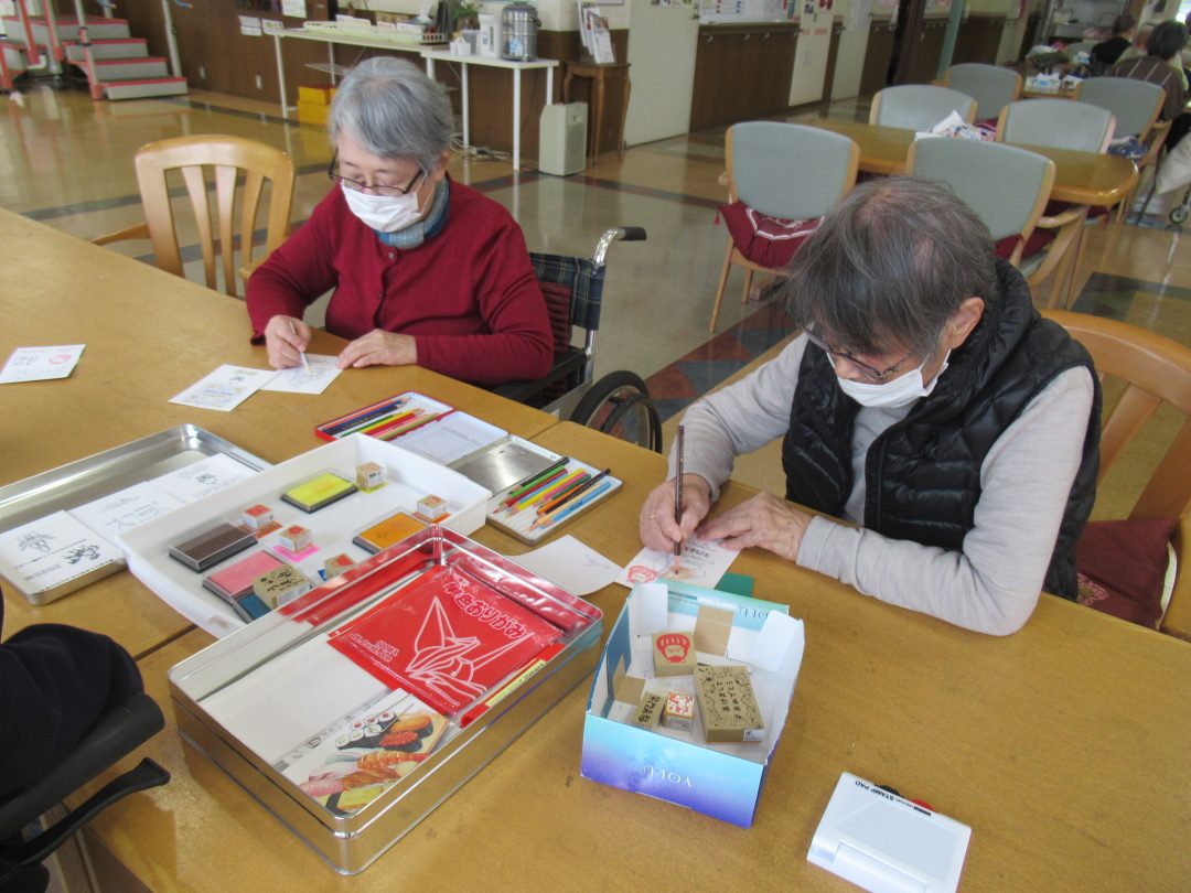 新年を迎える準備として、年賀状作りをしました。はがきに色を塗ったり、スタンプを押したりと、皆様思い思いのデザインを作られていました。「孫にあげるんよ。」「誰にあげようか。」「お世話になっとる人に渡すんよ。」など和やかな雰囲気の中で作成が進みました。