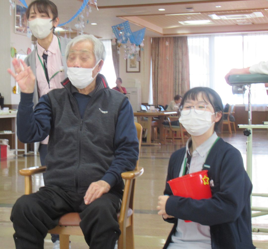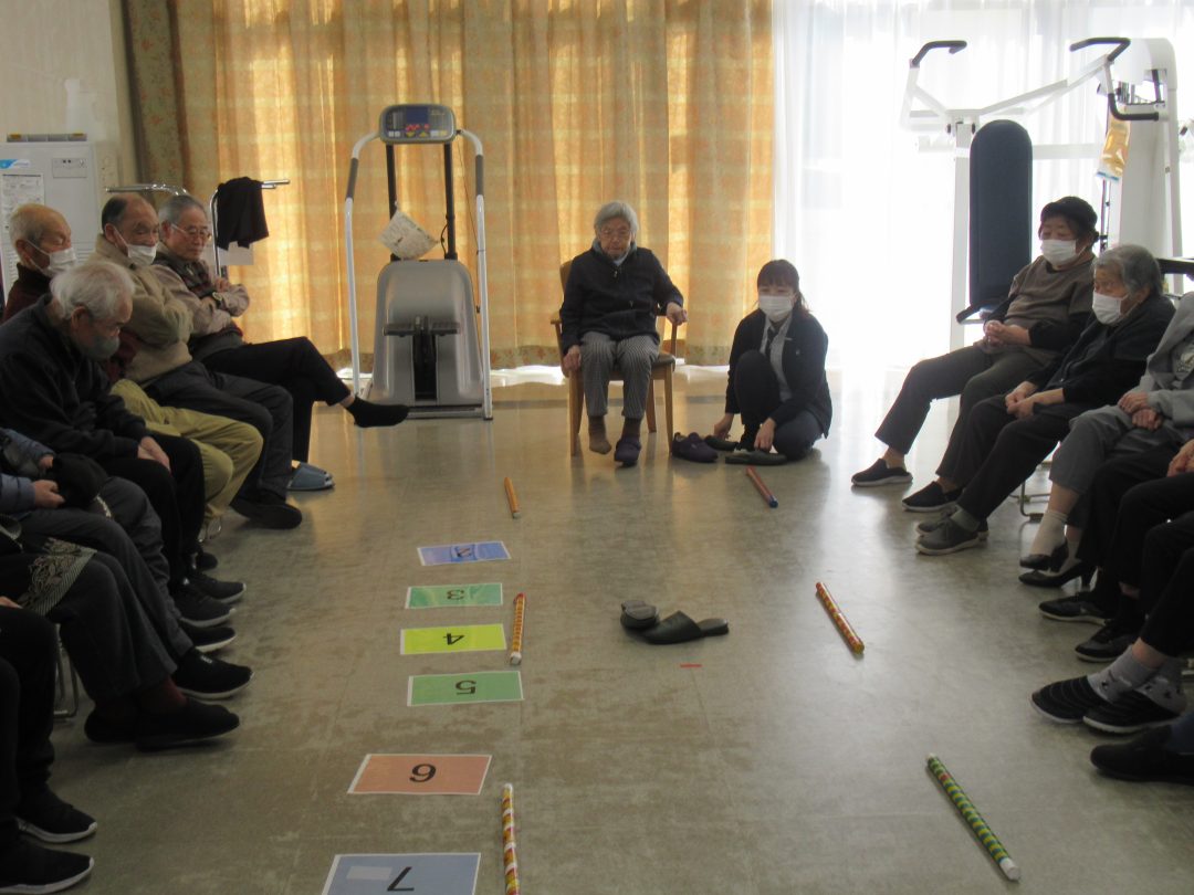 体力作りの日のレクリエーションでは、始まりの準備運動、スリッパ飛ばし、わっか送りなど、座って身体を動かして楽しみました❤