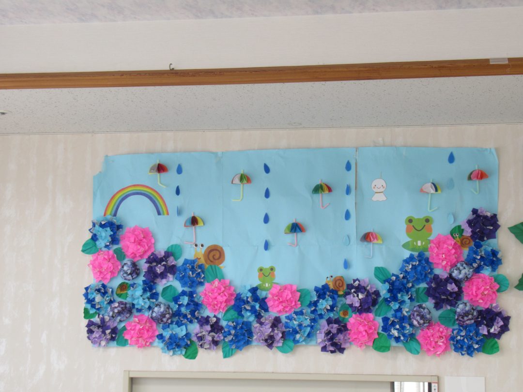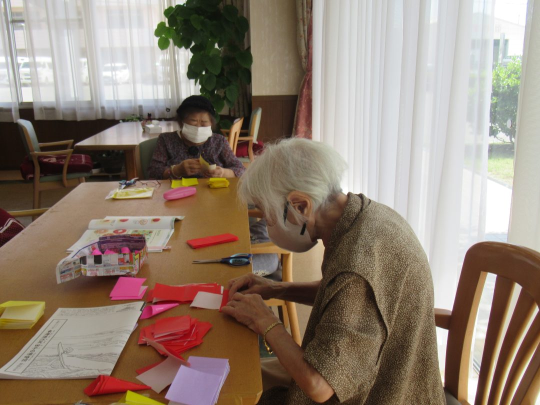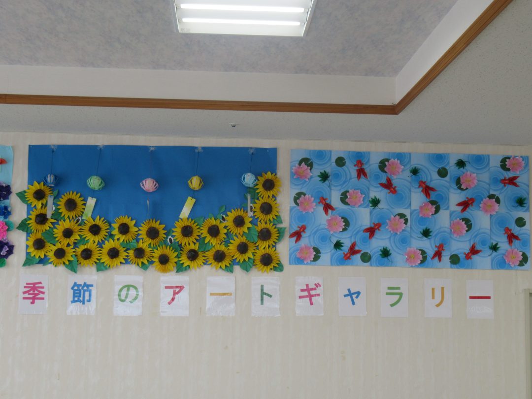 デイセンターザトペックでは、季節ごとに壁いっぱいにおおきな作品を利用者様と職員で一緒に作っています。色画用紙を選んだり、折り紙を折ったりとそのひと時が、笑顔と会話でいっぱいになります💚💛8月は紫陽花と梅雨の風景「雨の日も明るくなるね。」とニコニコ。7月は金魚と蓮の池をイメージしました。8月は、大きな向日葵をさかせました。9月は宵に咲く月下美人を作成しました。「ここを私が作ったんだよ。」と話してくれたりもしました。