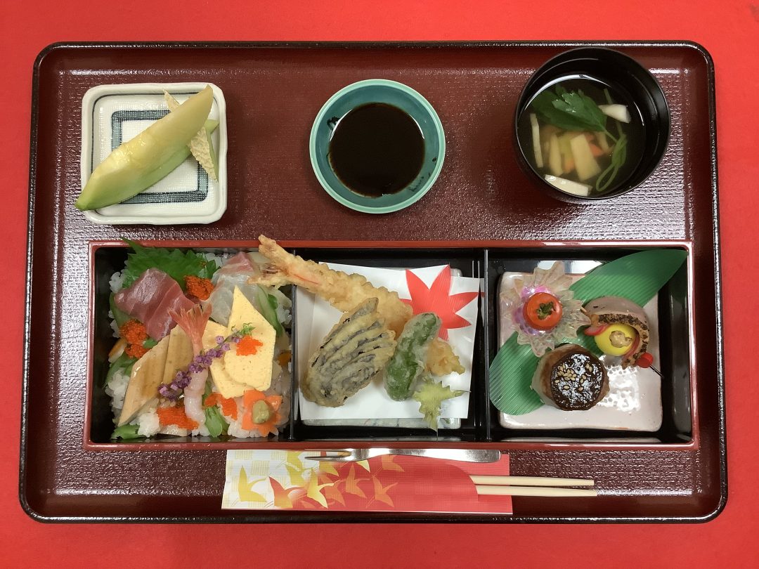 膳を彩るのは、鮮やかな海鮮祝い寿司をメインに、サクサクのエビと秋野菜の天ぷら、見た目も美しい秋彩三種盛(カモのピンチョス、トマトファルシー、里芋田楽)、そして香り豊かなきのこと紅葉麩のお吸い物。食後にはみずみずしいメロンも添えました。