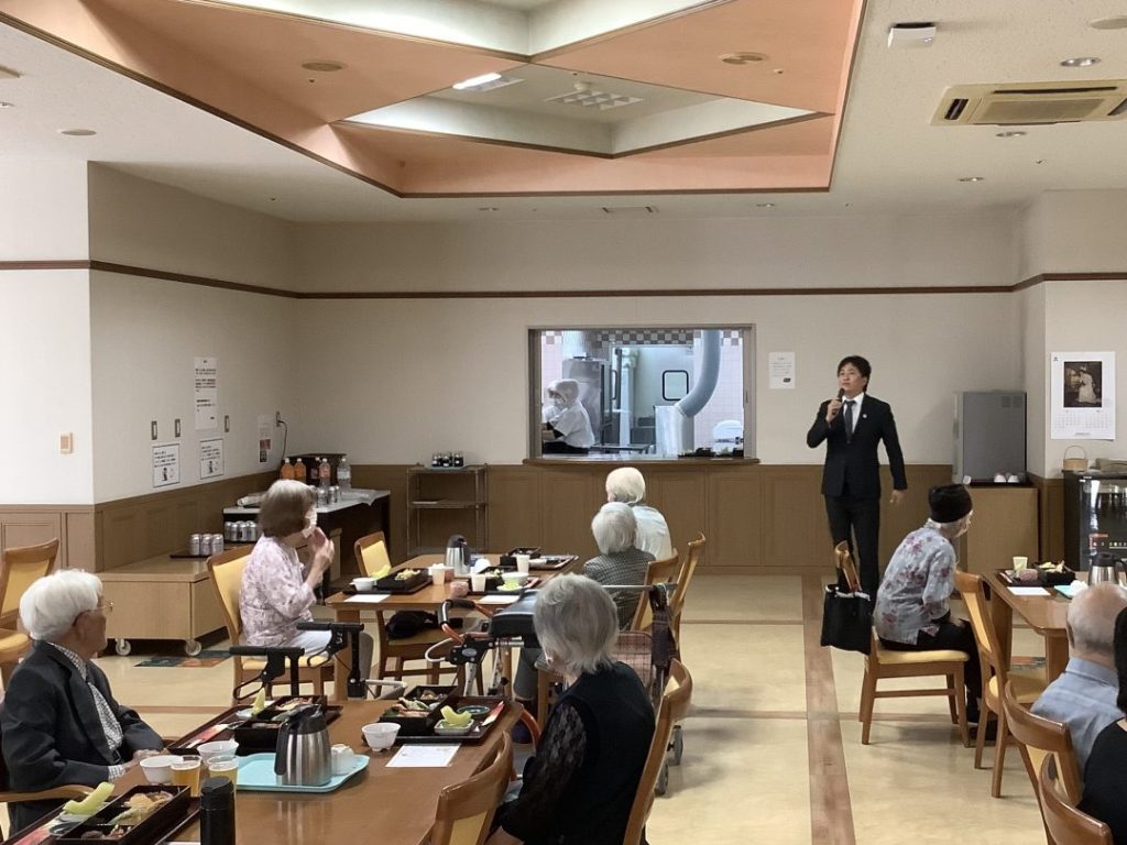 昼食会のはじめに、施設長より入居者様へご挨拶させていただきました。22年という節目の年を迎えることができた感謝の気持ちと、これからも皆様に安心して快適にお過ごしいただけるよう、職員一同努めていくという決意をお伝えしました。