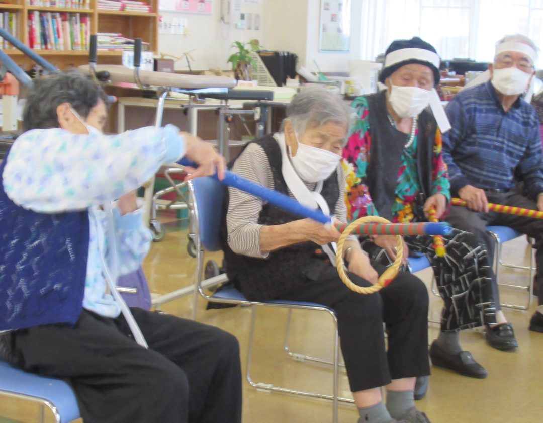 隣の利用者様に棒を使って、わっかを通していくゲームです。