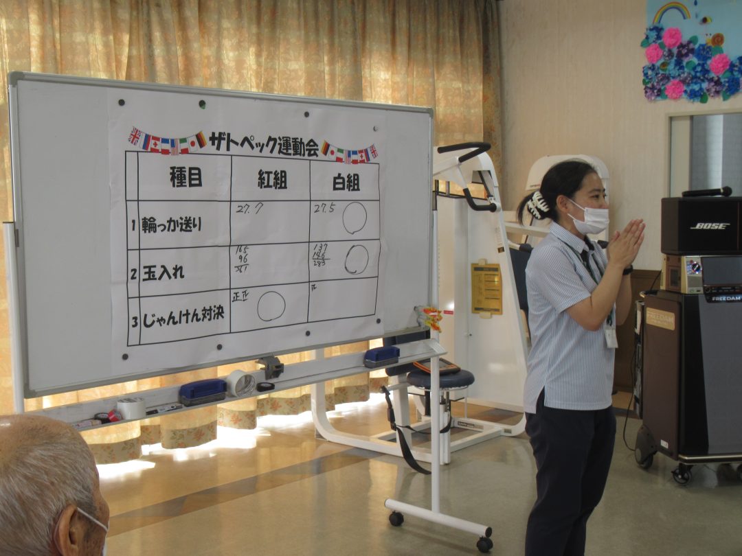 『宣誓、我々、選手一同は日頃の体操やゲームでの経験を活かして、ザトペック運動会をみんなで力を合わせて、一生懸命に、安全に、怪我なく、全力で楽しむことを誓います。』