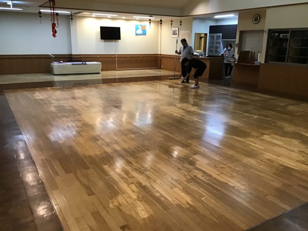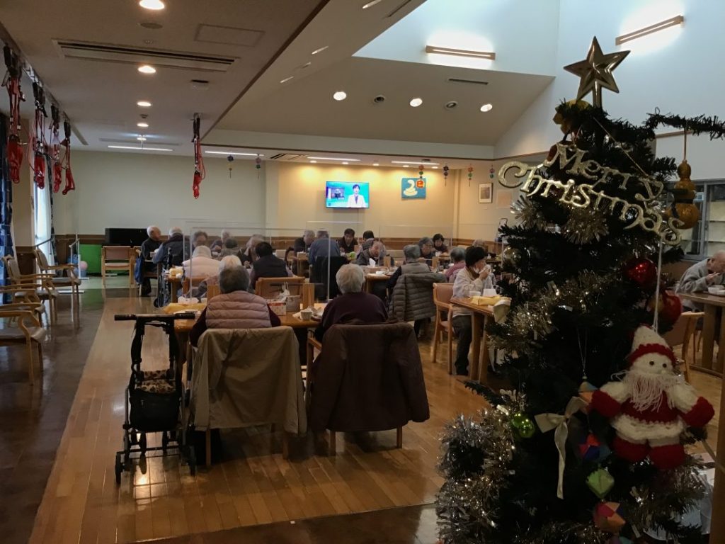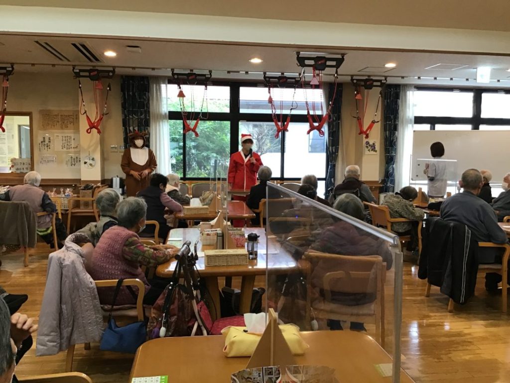 職員で力を合わせて取り組みピカピカに床が綺麗になったデイルームで、年末のクリスマス会を開催することができました。