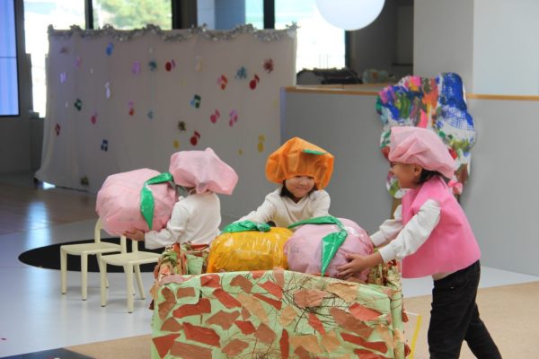 こびとに興味津々の子どもたち。園の中や散歩に出かけた時など「どこかにこびとがいないかな」と探している姿が見られ、劇ごっこに広がっていきました。「どんなこびとになりたい?」とイメージを膨らませながら、子どもたち一人ひとりが考えたこびとが登場する世界に一つだけのストーリー。観覧席にいる保護者の方がこびとを見つけて「みーつけた」と言うとこびとが登場し、保護者の方も参加型の場面を楽しんでいました。