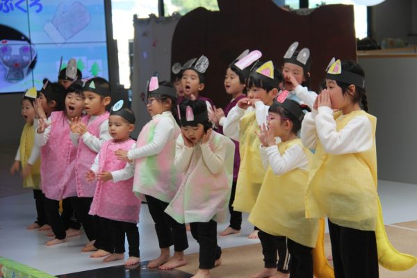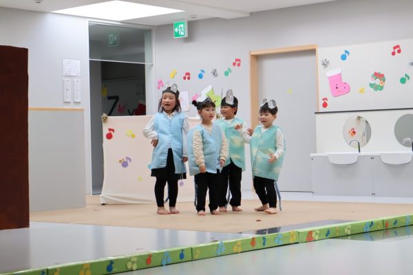 色々な絵本の中でも、なじみがありよく知っていた「てぶくろ」を題材にし、題名はほしチーム全員で決めた「みんなのてぶくろ」題名通り、登場する動物やダンスの振り付けもみんなで決めました。森の可愛い動物たちが次々に登場!みんなの優しさ、温かさがつまった「みんなのてぶくろ」は心温まる劇ごっこでした。