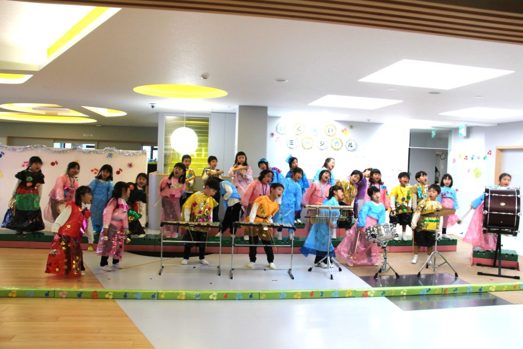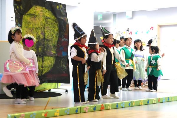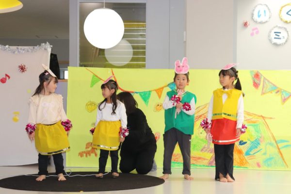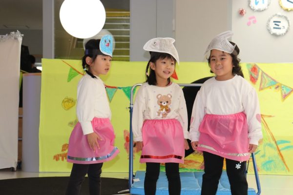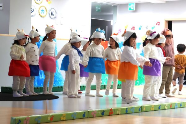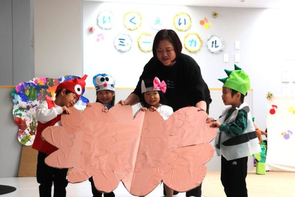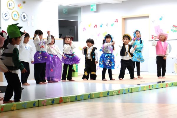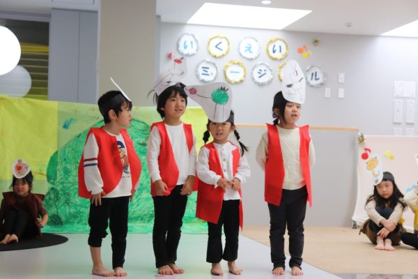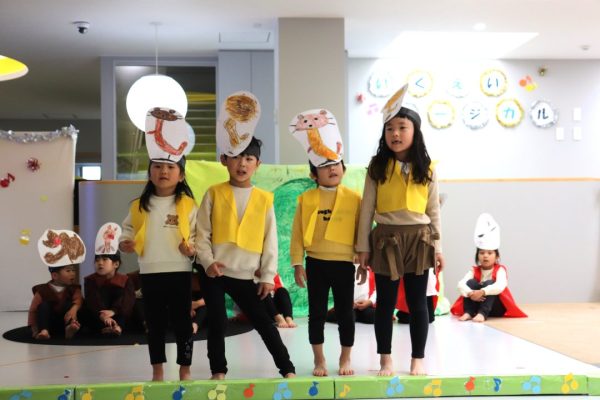 英語教室や音楽教室で英語の歌、リズム遊びや楽器に触れたことで、音を楽しむ子どもたち。教室が終わると、うたった歌を口ずさんだり、「楽しかった~」と友だちと話をしたりするほど、身近なものとなっています。キャンプに出かけるストーリーと音楽家になるストーリーと素敵なステージを披露してくれた4歳児の子どもたちです。