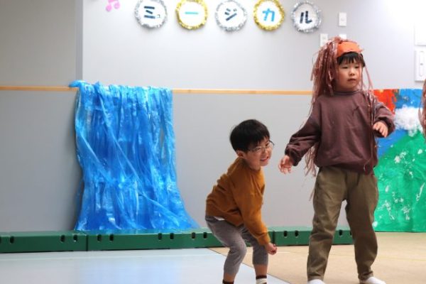 山の動物たちが集まって「おならくらべ」をする、ユーモラスで楽しい劇ごっこ。子どもたちは、それぞれの動物になり、イメージを膨らませながら、個性的なおならを披露し、最後にみんなで楽しいダンスを披露しました。