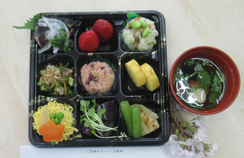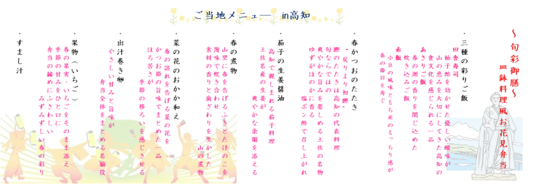 桜の木の下で、高知のご当地メニューを詰め込んだ九枡弁当を広げた瞬間