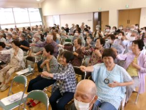 令和6年6月11日(火) 鴨島町老人会『天寿会』(飯尾東地区 飯尾西地区 飯尾南地区 敷地地区)の皆様、総勢80名が集まり、各地区のお誕生者をお祝いするお誕生会に招かれ、【認知症について】のお話と【認知症予防体操・認知症予防ゲーム】を行い、楽しい一時を過ごしました♪♪