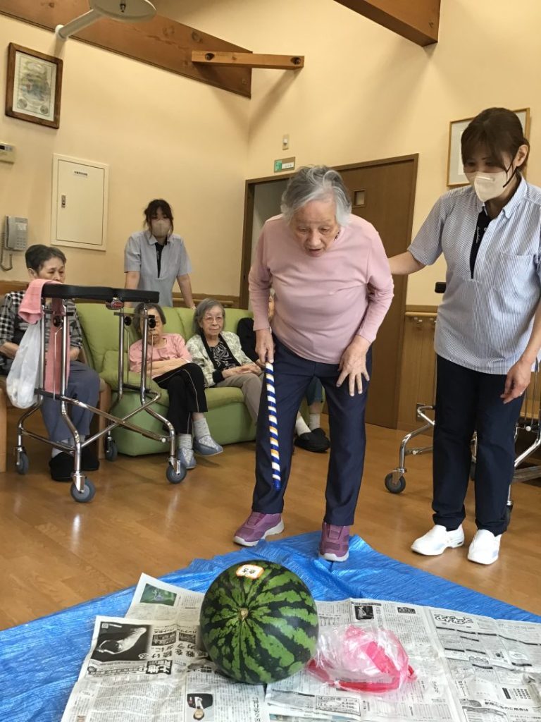 全ユニットの入居者様が集結しいざスイカ割に挑戦!!(^^)!!