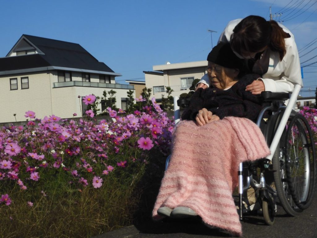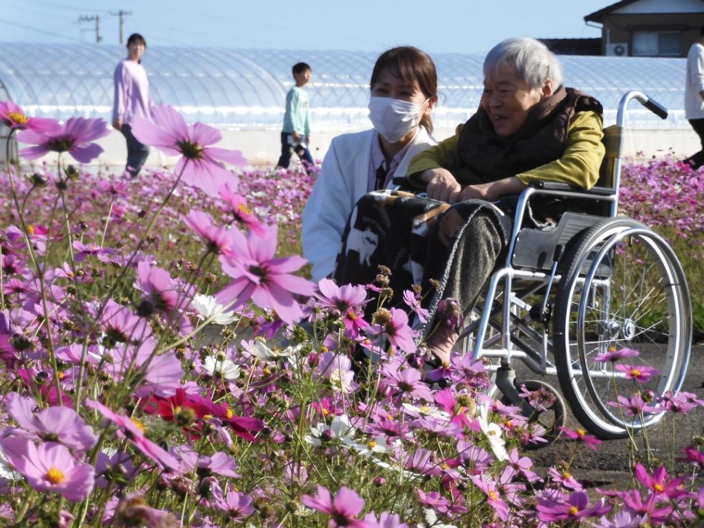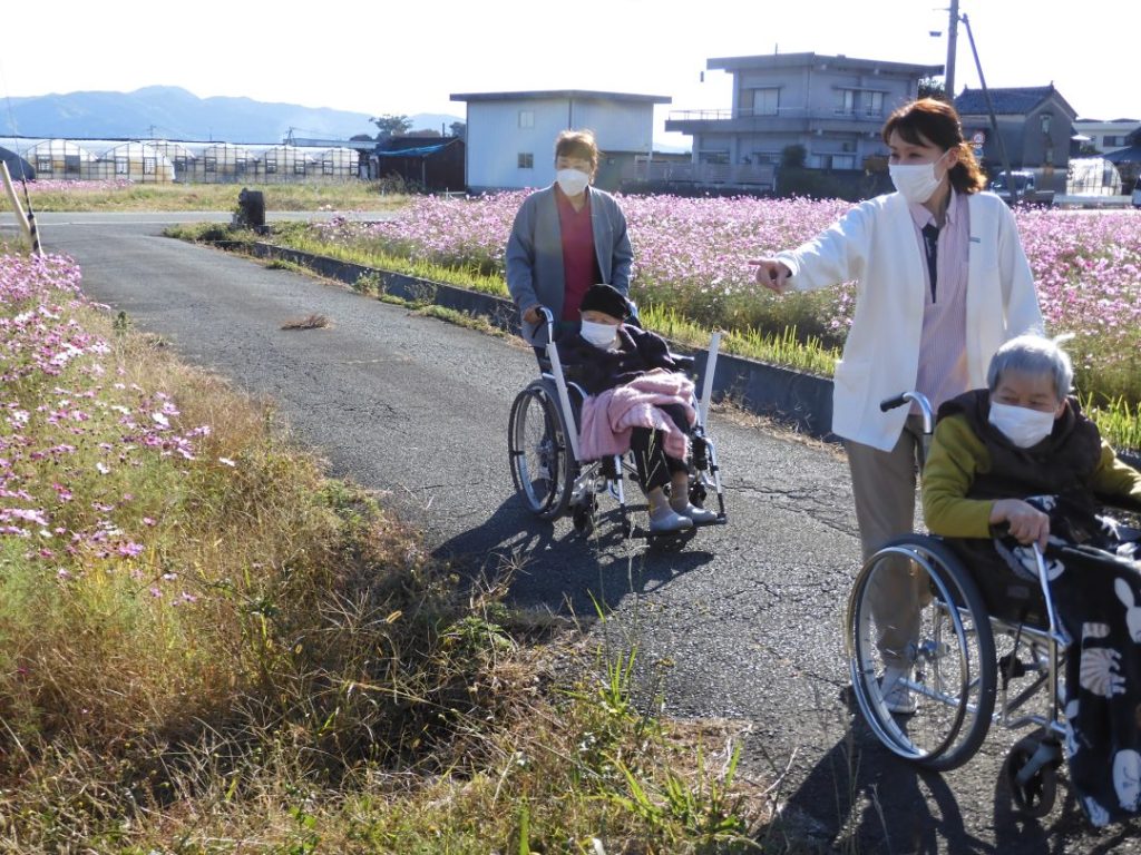 天候よし、風なし 普段寒いと外出したがらない入所者者も「綺麗やな、色が濃いけん、ええわ」とご満悦。