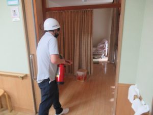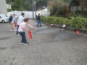 消防士さんから消火器の使用方法について指導を受け、実際に的🔥に向かって放水!
