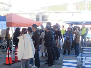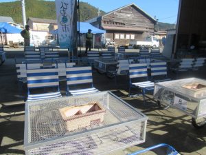 ひわさの市では魚介類の販売や、グルメ屋台、BBQが行われており、私たちは会場設営や、イベントの運営サポートをさせていただきました。