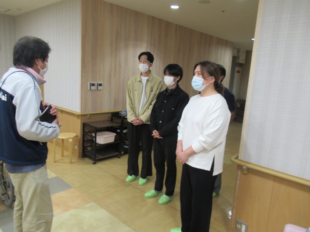 今回の実習は「高齢者医療・福祉」というテーマのもと高齢者が住み慣れた地域で生活するにはどのような制度があるか、病気を抱えながら生活するにはどのような支援が必要かを知り、入院患者としてではなく、自然な形で普段と変わらない生活を送る、そんな高齢者の方達と関わる機会を持つことを目的に行われました。