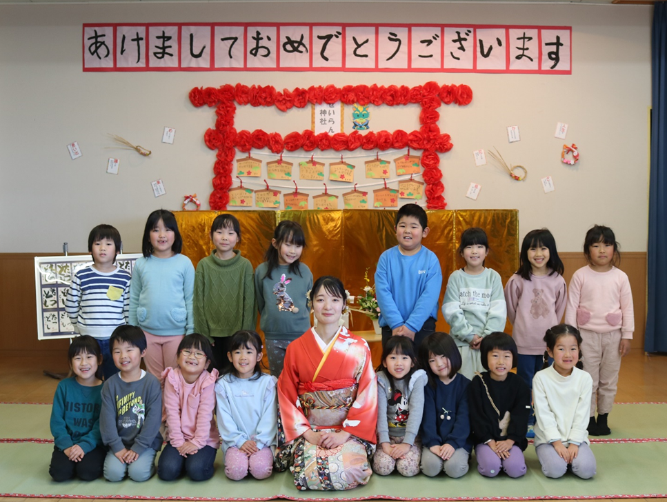 着物姿の先生(年女)より神様からの飲み物を頂くと、いつもと違う雰囲気にドキドキしている表情の子どもたちでした。