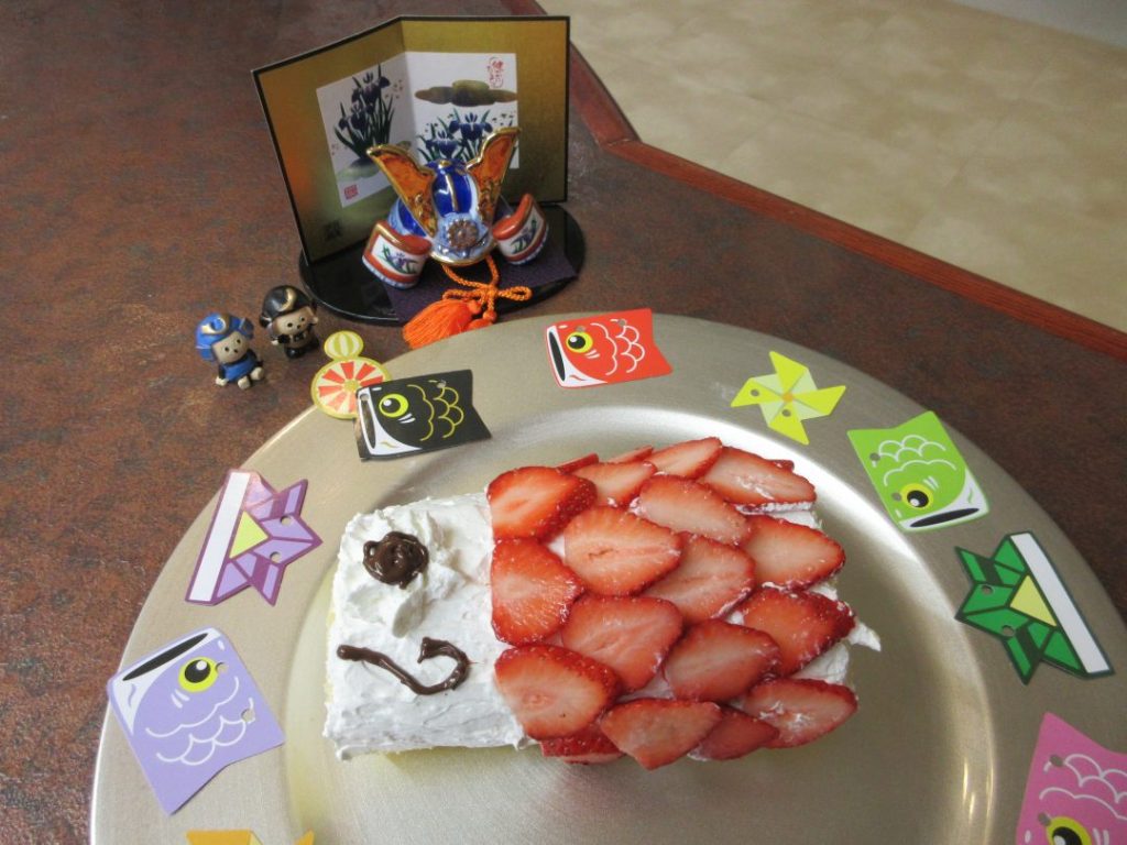 ロールケーキに生クリームを塗り、いちご🍓やキウイ🥝をこいのぼりのうろこに見立てて、デコレーションしました😊✨