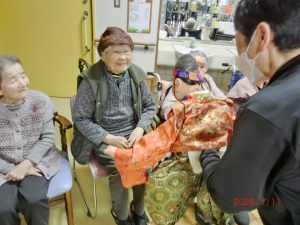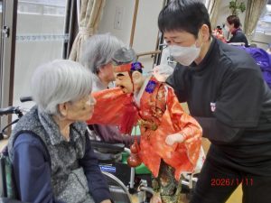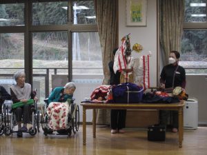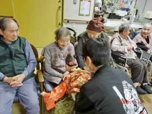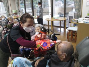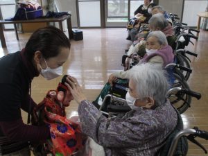 利用者様の頭や肩にふれていただき、福をいただきました。