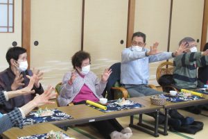 体操とゲームでひと笑い、談笑しあい、早口言葉でまた笑い
