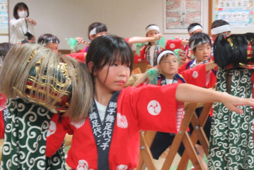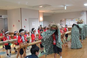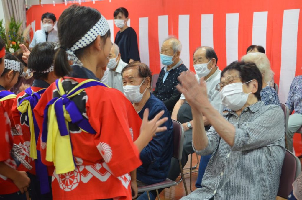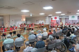 午後には、足代小学校3年生・4年生による竹太鼓と獅子舞の披露がありました。利用者様は、かわいい獅子舞や竹太鼓に大喜び。手を叩いて応援されました。最後には、小学生に感謝の握手をし、子どもたちからも長寿のお祝いを頂きました。大感激です。