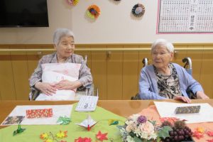 今年も東西横綱は、東が北川タツノ様(105歳)、西が桑原ユタカ様(102歳)でした。記念品は、社会福祉法人健祥会 桝田和平部長より贈られました。ご家族とご長寿をお祝いされました。
