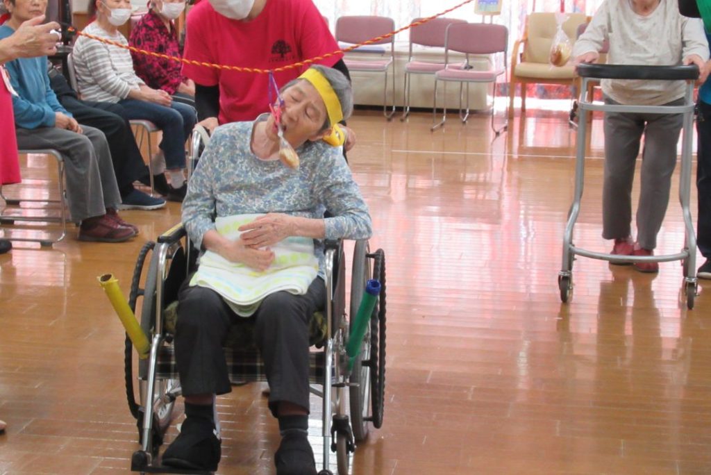 「歯がないから取れん」「このパンよう動くわ」と笑い声が響き、楽しいパン食い競争になりました。