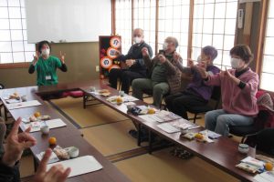 田中機能訓練指導員からグー・チョキ・パー・ウサギ体操でひと笑い