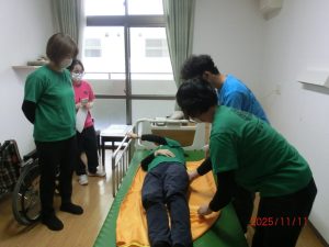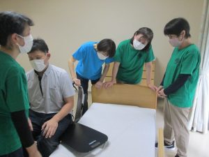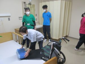 第2研修会場では、スライドボード(お尻を載せて横にすべることができます)を使ってベッドから車イスへ移乗介助しました。
