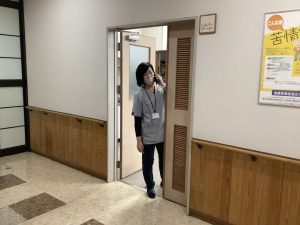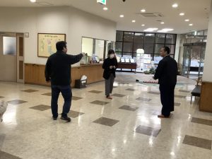 まずは受付職員が慎重に距離を取って対応し、不審者の方に施設から出ていくように説得しています。