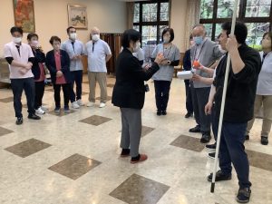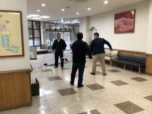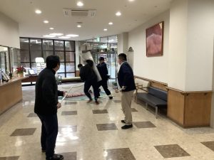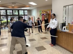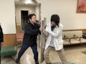 「さすまた」を手に、2人で協力して不審者との距離を保ち、応援の職員が車いすで距離をとれるようにロビーへ駆けつけました。