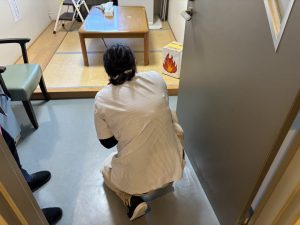 震度6強の地震が起こった想定で、利用者様に頭を守ってもらい安全を確保します。