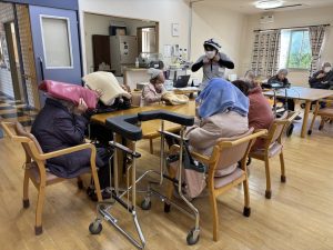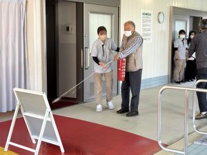 デイサービスの利用者様にも参加して頂き、消火器を扱う手順を学びました。