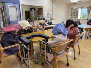 震度6強の地震が起こった想定で、利用者様に頭を守ってもらい安全を確保します。