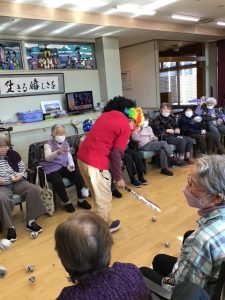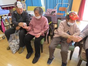 すぐに手に持った「豆(新聞紙を丸めた特製豆)」を全力で投げ始めました。