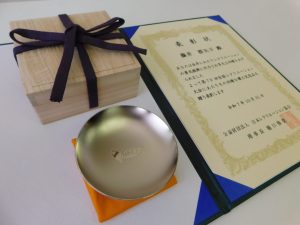 ※施設では、持ち帰られた賞状と記念品をみせていただき、このように写真に収めさせていただきました。