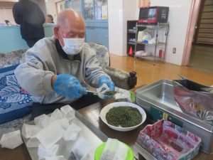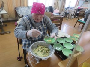 デイサービスセンターでは、ご利用者に昼食のつぎ分けをしていただいてます🍚