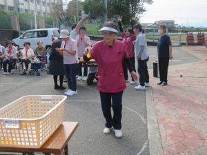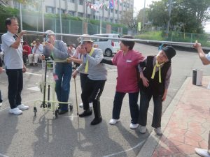 パン食い競争同様に、車椅子も、歩行器も関係なく、不安な方は職員が側で支えながらの競技となり