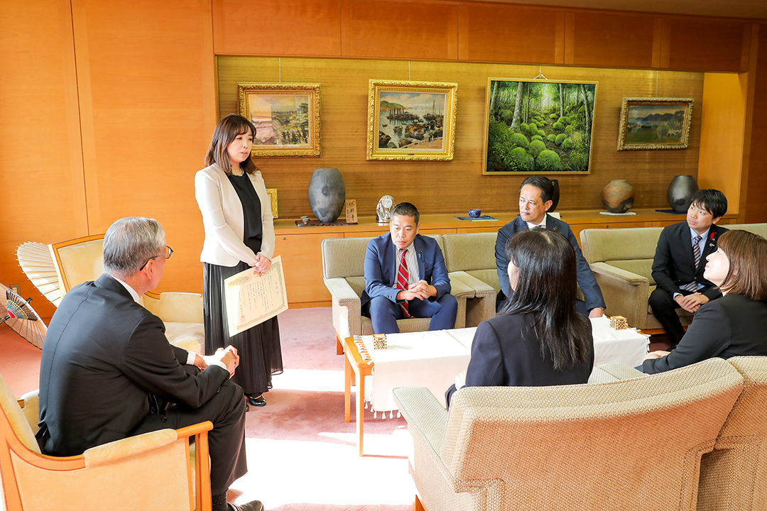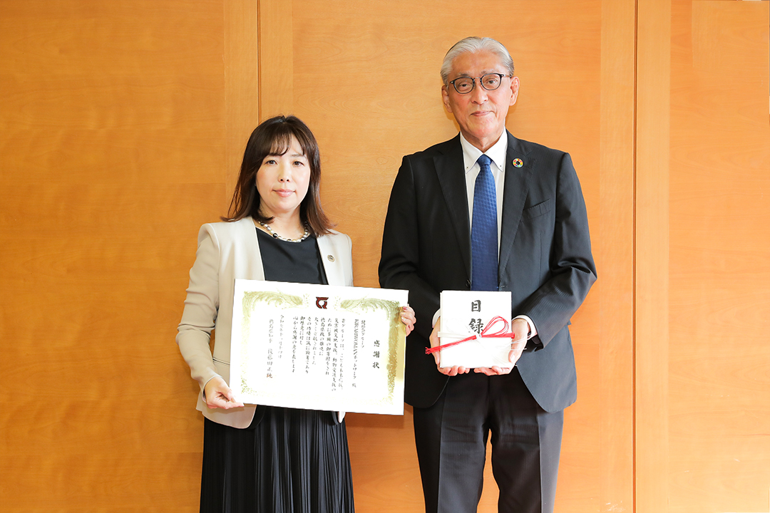 貴重なご寄付をいただき、誠にありがとうございます。KIRARI WOMAN ネットワークの皆様の自己研鑽の活動や地域活動など、日頃の様々な取り組みに対し心より敬意を表します。徳島県では、本年4月より「とくしまこどもまんなか大作戦(徳島県こども計画)」がスタートし、こどもも子育て当事者も過度な使命感や負担を抱くことなく子育ての喜びを実感できるよう、関連施策を重点的に推進しているところです。また、被災者支援、動物愛護も重要なテーマですので、今後ともいろいろとご提言をいただけますようお願いします。