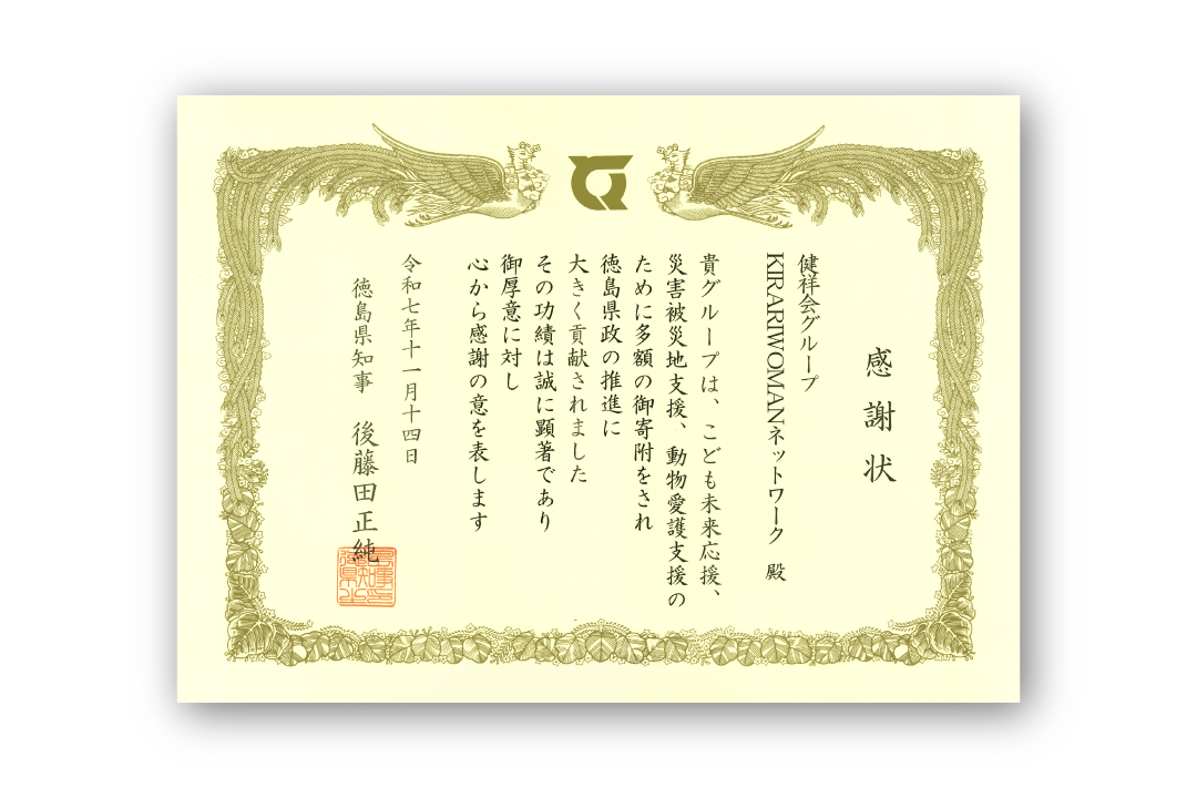 貴重なご寄付をいただき、誠にありがとうございます。KIRARI WOMAN ネットワークの皆様の自己研鑽の活動や地域活動など、日頃の様々な取り組みに対し心より敬意を表します。徳島県では、本年4月より「とくしまこどもまんなか大作戦(徳島県こども計画)」がスタートし、こどもも子育て当事者も過度な使命感や負担を抱くことなく子育ての喜びを実感できるよう、関連施策を重点的に推進しているところです。また、被災者支援、動物愛護も重要なテーマですので、今後ともいろいろとご提言をいただけますようお願いします。