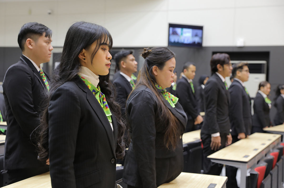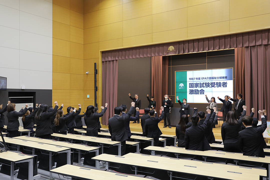 介護福祉士国家試験を明日に控え、今年受験する35名のEPA介護福祉士候補者の激励会が健祥会トゥモローホールで開かれました。徳島・香川の27名がトゥモローホールで、大阪・京都4施設の8名はそれぞれ施設からリモートで、いずれもトゥモローネクタイ・スカーフを身につけて激励会に臨みました。