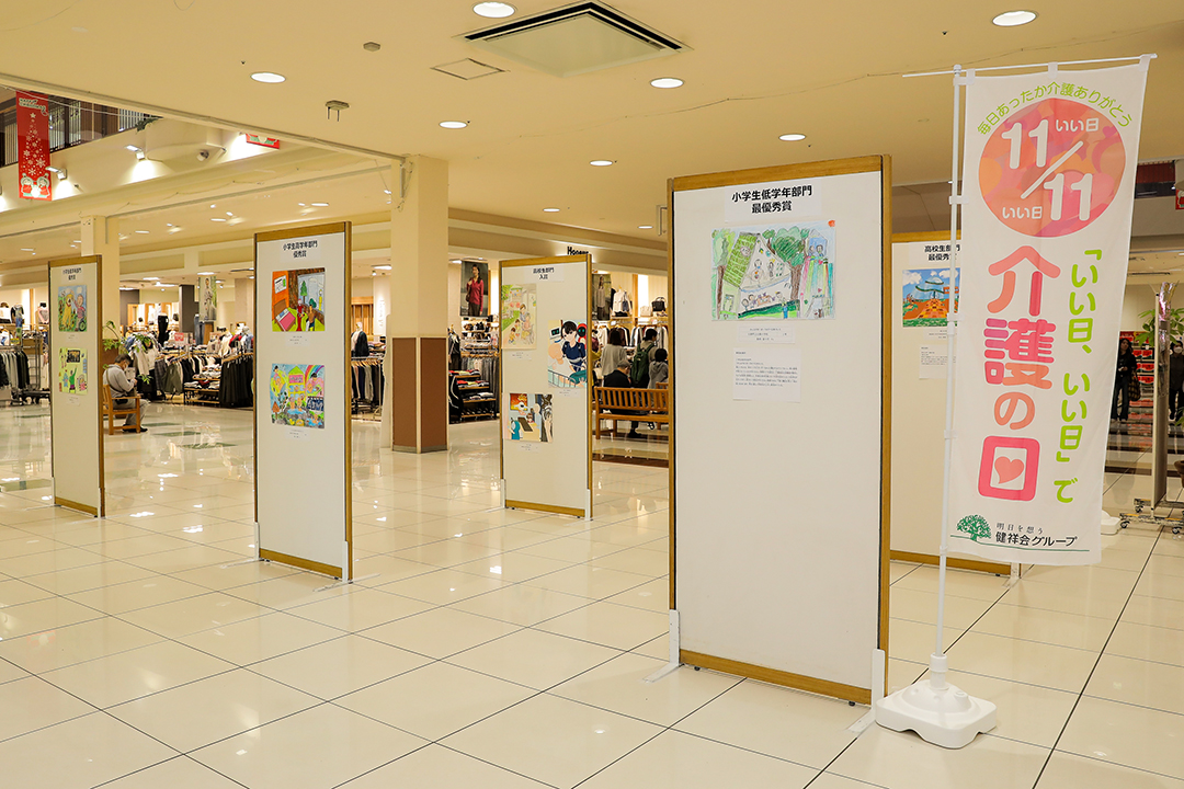 楽しい発想ややさしさにあふれた作品ばかりでしたが、学園内部での1次審査、外部からの審査員を招いての2次審査を経て入賞作品を決定。小学生低学年、小学生高学年、中学生、高校生の4部門各6作品、合計24作品の表彰式と展示が、11月11日の介護の日にちなんだ介護フェアの一環として石井町の商業施設で行われました。この機会が福祉や地域社会への関心、介護の仕事への興味を育むきっかけとなることを願って、受賞したみなさんに表彰状と図書券をプレゼント。子どもたちと介護の新しい関係づくりとなったこのコンテストの模様は、国府町CATV、徳島新聞など地域のメディアから取材いただきました。