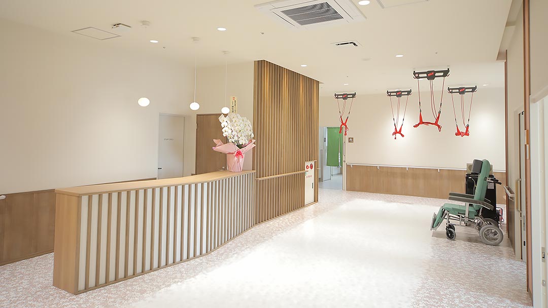 - (特養)居室(個室5室、2人室10室)、食堂、機能訓練室、ふれあいコーナー、医務室、ステーション、静養室(ケアハウス)居室(個室6室、2人室1室)、娯楽コーナー