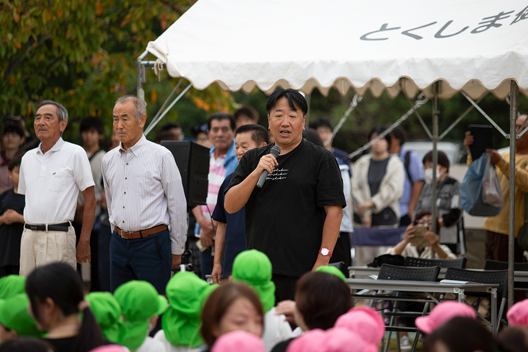 10月11日、「輝け笑顔!つながれ心」とスローガンを掲げたとくしま健祥会認定こども園「人間力づくり運動会」。空模様が心配されましたが霧のような小雨もあがり、はじまりを告げるファンファーレの後、園児たちが元気に入場行進。開会式で健祥会グループ理事長 中村太一がご挨拶申し上げました。