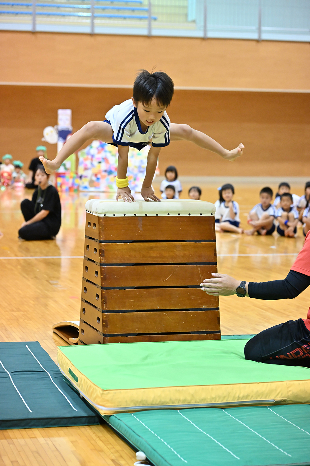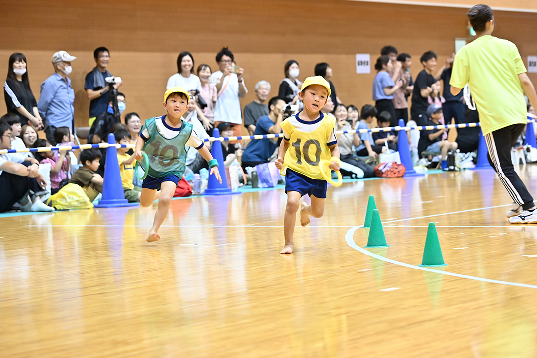 「力を合わせて頑張ることを誓います」と5歳児のかわいい宣誓でスタート。全員体操に続いて、徒競走、お遊戯、組み体操、跳び箱、鉄棒、リレー、親子競技など、年齢ごとの発達に応じた16のプログラムが、体操教室の河野磨先生のサポートで進みました。どの子もどの種目でも精一杯頑張り、7段8段9段と高く積まれてゆく跳び箱に挑戦する姿や一生懸命走る姿にはひときわ大きな拍手と声援が巻き起こりました。