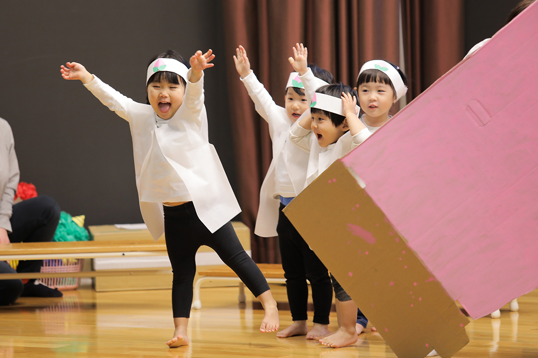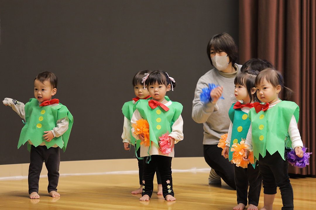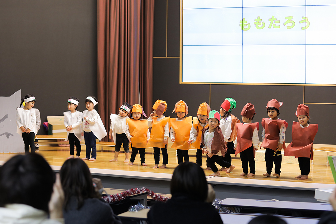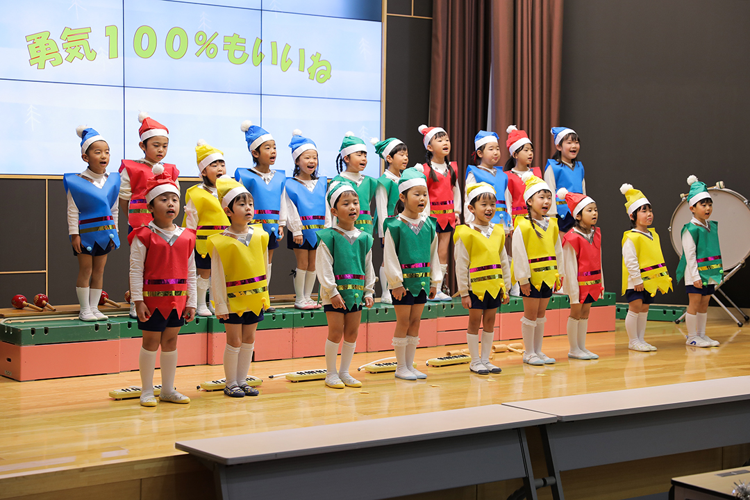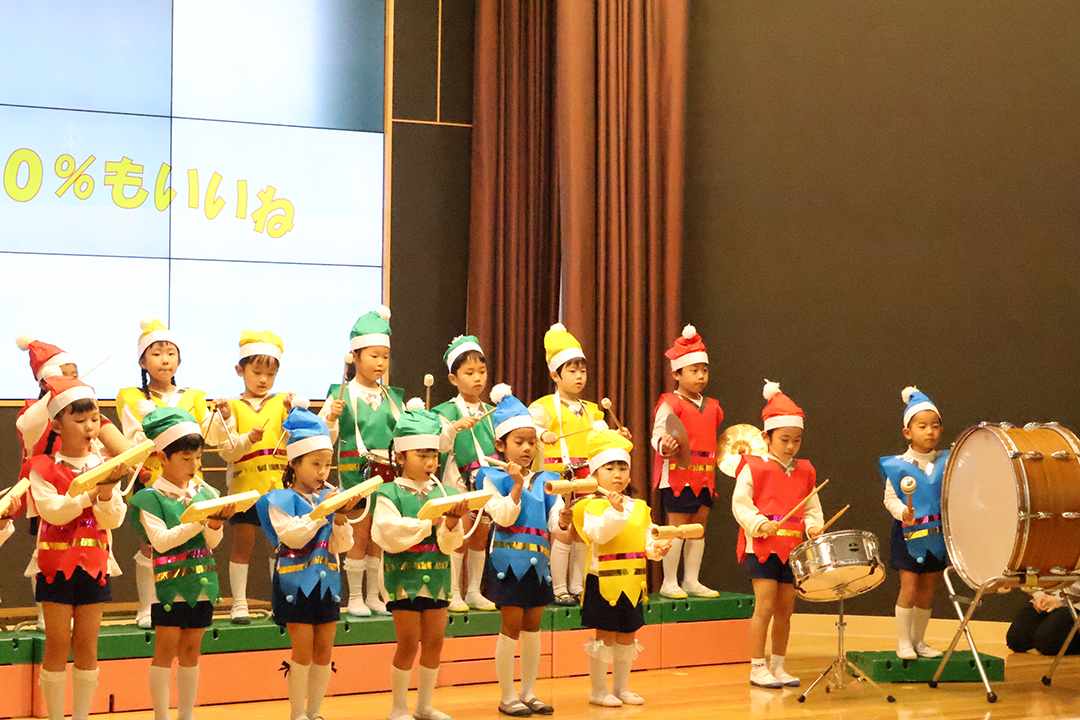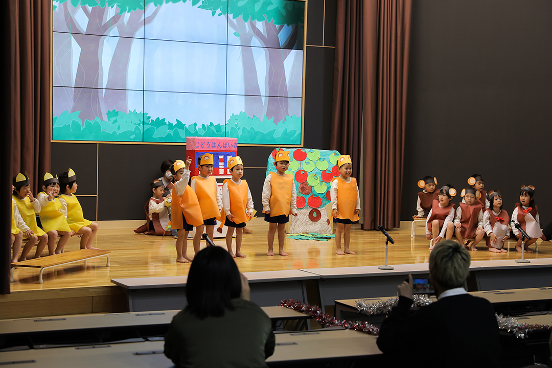 大きなホールのステージの上で1歳児から5歳児までが、それぞれ一生懸命にそして立派に劇や歌を披露する姿には1年間の大きな成長が感じられ、保護者の皆様も感慨ひとしおだったようです。演じる子どもたち、見守る保護者の皆様、みんなが終始、幸せいっぱいの笑顔。フィナーレにはお待ちかねのサンタさんが登場し、子どもたちにプレゼントを手渡してくれました。
