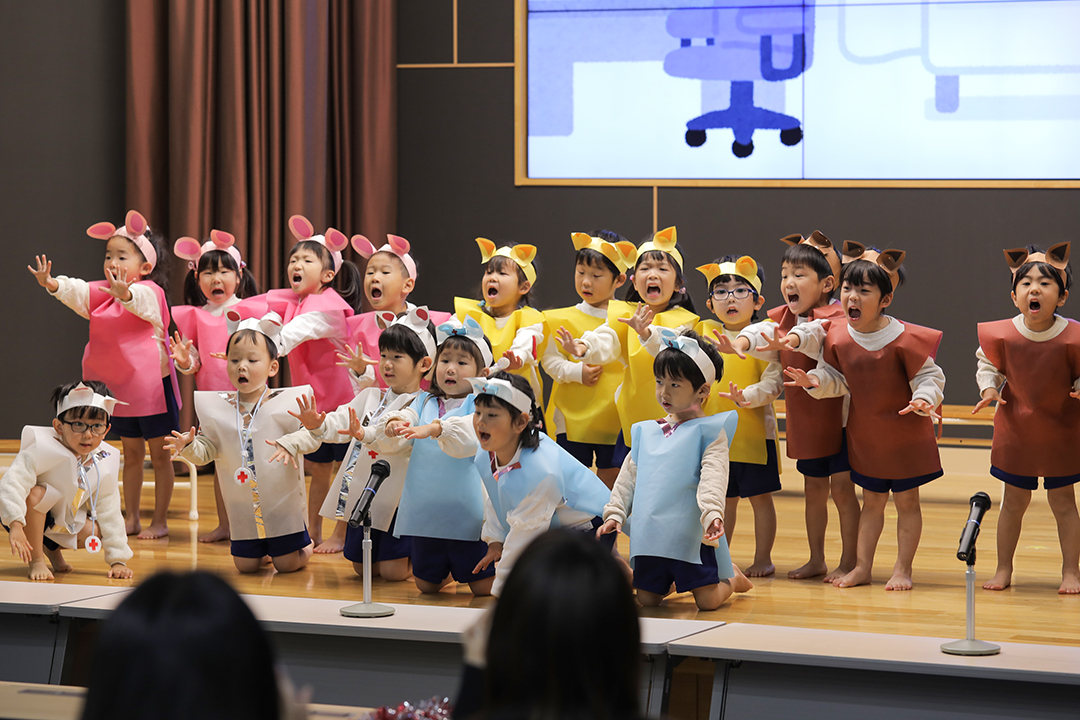 子どもたちが年次ごとに劇やお遊戯、歌や合奏を張り切って披露する1日。子どもたち自身にとっても保護者の方々にとっても、大変楽しみな行事です。今年は「WINTER WONDERLAND ~キラキラかがやけ!! みんなの心~」をタイトルに、子どもたちのキラキラの発表を、参加の人数制限なしでおじいちゃまおばあちゃまにも見ていただくことができました。