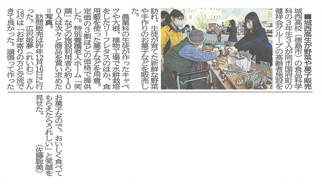 この記事は公開から1年以上経過しています メディア掲載記事 2022年1月6日(木) 城西高生が野菜や菓子販売 | 徳島新聞 ■徳島新聞(2022年1月6日朝刊) [記事公開日]2022/01/06(木) 笑顔 城西高生が野菜や菓子販売 | 徳島新聞 新しい記事 新春トップインタビュー|徳島新聞 古い記事 吉野川高生がスクールカフェで接客 | 徳島新聞 過去の記事へ